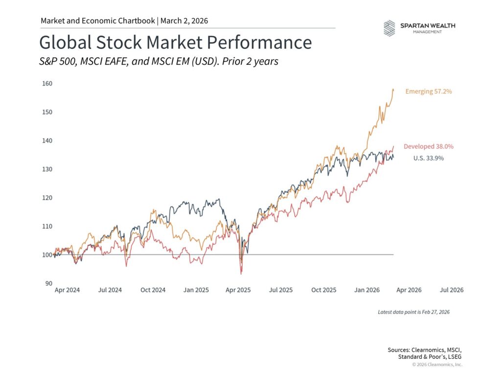 One of the most notable developments in February was the continued outperformance of asset classes beyond U.S. large-cap stocks. International developed markets rose nearly 5% for the month, while emerging markets gained over 5%. U.S. small caps posted their strongest monthly gain since August, with the Russell 2000 surging roughly 5% year-to-date, far outpacing the S&P 500.